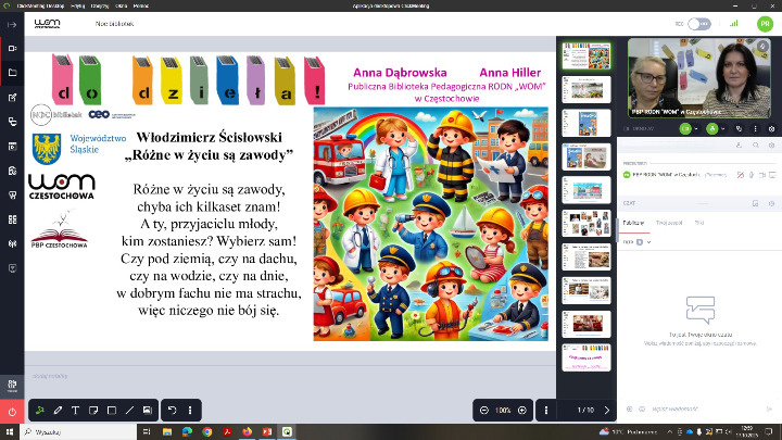 Kolejne spotkanie online pod hasłem „Do dzieła! Kim będę, gdy dorosnę?”, skierowane było do uczniów klas I–III szkół podstawowych. Podczas spotkania dzieci wysłuchały dwóch opowiadań z książki Pawła Beręsewicza „Zawodowcy”, dzięki którym poznały specyfikę pracy cukiernika, piekarza i kucharza. Całość uzupełniono filmami edukacyjnymi, które w ciekawy i przystępny sposób przybliżyły uczestnikom świat zawodów oraz zachęciły do rozwijania własnych zainteresowań i pasji.