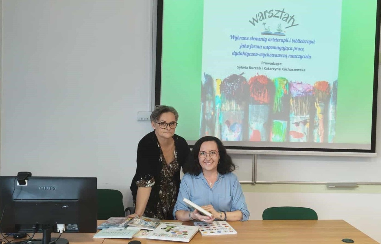 Nauczyciel bibliotekarz Katarzyna Kucharzewska i nauczyciel-konsultant Sylwia Kurcab przeprowadziły dwa szkolenia dla nauczycieli "Wybrane elementy arteterapii i biblioterapii jako forma wspomagająca pracę dydaktyczno-wychowawczą nauczyciela". 3 października 2025 r. odbyło się webinarium, natomiast 6 października 2025 r. warsztaty stacjonarne. Prowadzące szkolenia omówiły, jak w prosty i kreatywny sposób dotrzeć do uczniów i wesprzeć ich rozwój emocjonalny i społeczny. Zaprezentowały różnorodne metody pracy z uczniem, a także pokazały jak stworzyć bezpieczną i inspirującą przestrzeń do nauki.