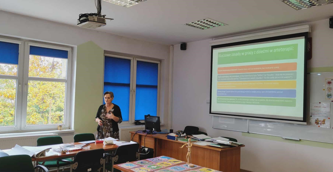 Pani Sylwia Kurcab zwróciła uwagę uczestnikom szkolenia na czym polega terapeutyczna moc sztuki. Podkreśliła, że arteterapia (terapia sztuką) jest bardzo popularną i rozwijającą się formą wsparcia, która wykorzystuje proces twórczy (malarstwo, rysunek, muzykę, teatr, ruch itp.). Narzędzia te służą do wyrażania emocji, pracy nad sobą i rozwoju osobistego. Podkreśliła w swojej wypowiedzi, że nie chodzi o stworzenie „pięknego" dzieła, ale o proces tworzenia i refleksję nad nim. Działania w ramach terapii przez sztukę pozwalają bowiem w bezpieczny sposób wyrażać emocje, redukować stres, budować samoświadomość i pracować nad trudnościami.