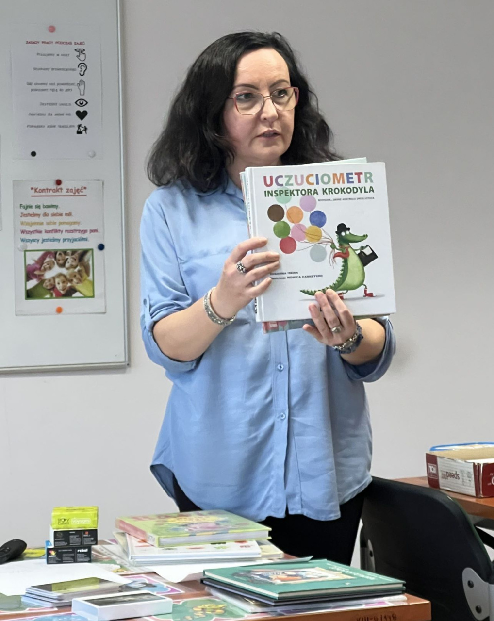 Katarzyna Kucharzewska przedstawiła metodę biblioterapii jako metodę pracy z uczniem przy wykorzystaniu książki, opowiadania, bajki terapeutycznej czy innego materiału czytelniczego. Zaprezentowała przydatne narzędzia, metody i techniki biblioterapeutyczne oraz literaturę terapeutyczną dotyczącą poczucia własnej wartości, emocji, praw dziecka, wartości życiowych i odporności psychicznej. Grupa poznała także, jak pracować z tekstem biblioterapeutycznym na zajęciach.